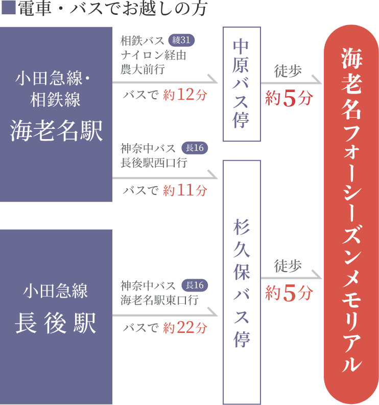 小田急線、相鉄線、JRの3路線が乗り入れるターミナル駅「海老名駅」よりバスで約17分。海老名フォーシーズンメモリアルは公共交通機関で来園可能な、アクセス環境抜群の霊園です。綾瀬市、藤沢市からは車で約5分、横浜市からも約30分と好アクセスです。